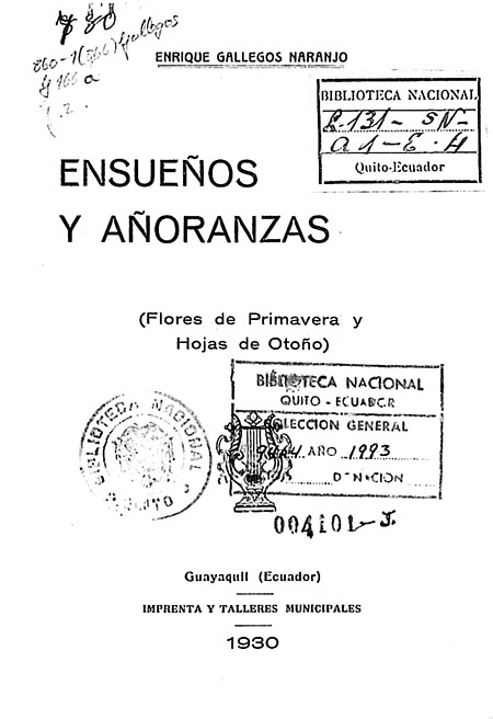 Cita Sugerida : | Gallegos Naranjo, Enrique. 1930. Ensueños y añoranzas (Flores de Primavera y Hojas de otoño). Guayaquil: Imprenta y Talleres Municipales. |