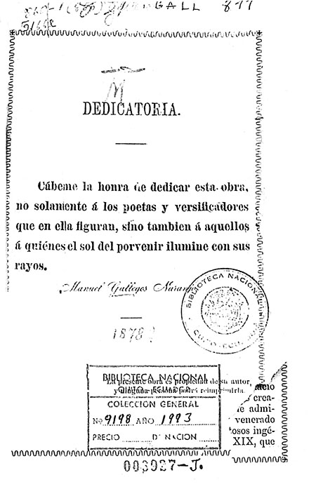 Resumen / Abstract : Si los ecos de la fama regalaron nuestros oídos, repitiéndonos los preciosos romances, poemas, idilios, leyendas y cantos líricos de los sublimes trovadores antiguos y modernos de la culta Europa; de esa Europa que cuenta ya largos siglos de civilización; si al estudiar las sublimes creaciones de la mente de Homero, Horacio, Virgilio, Goethe, Schiller, Rückert, Milton, Shakespeare, Byron, Racine, Molière, Marot, Bossuet, Lamartine, Víctor Hugo, Mme. de Sévigné, Cervantes, Lope de Vega, Calderón de la Barca, Fray Luis de León, Quevedo, Moratín, Nicasio Gallego, Bretón de los Herreros, los Argensola, el Duque de Rivas, Espronceda, Hartzenbusch, García Gutiérrez, Martínez de la Rosa, Zorrilla, Rubí, Campoamor, los Asquerino, Selgas, Manuel del Palacio, Blasco, Carolina Coronado, Boccaccio, Dante Alighieri, Metastasio y otros; si al escuchar, repetimos, las sublimes creaciones de la mente de tantos poetas, llenos de admiración y de entusiasmo hemos aplaudido y venerado a muchos de ellos, calificándolos de portentosos ingenios; así también, en el siglo XIX, que es, puede decirse, la época desde que data el verdadero desarrollo de la literatura en América, levantando la frente con noble orgullo hacia el cielo, poseídos de nuestras justas aseveraciones, damos también a conocer la lista de nuestros mejores poetas americanos, en la cual no escasean grandes ingenios e insignes versificadores, en perfecto conocimiento de las ciencias bellas y sobresalientes en los diversos géneros del arte poética.