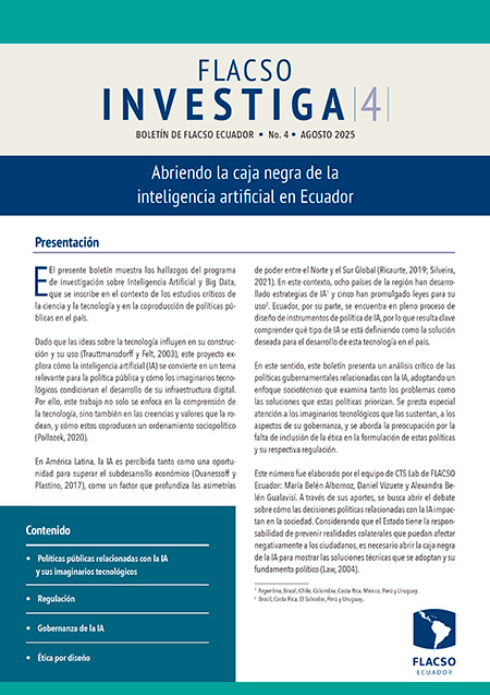 Cita Sugerida : | Albornoz Barriga, María Belén, Daniel Vizuete y Alexandra Belén Gualavisí Limaico. 2025. Abriendo la caja negra de la inteligencia artificial en Ecuador. Flacso Investiga. Boletín, 04. |