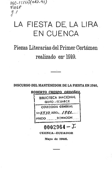 Cita Sugerida : | Crespo Ordóñez, Roberto. 1946. La fiesta de la lira en Cuenca. Cuenca: Imprenta de la Universidad |