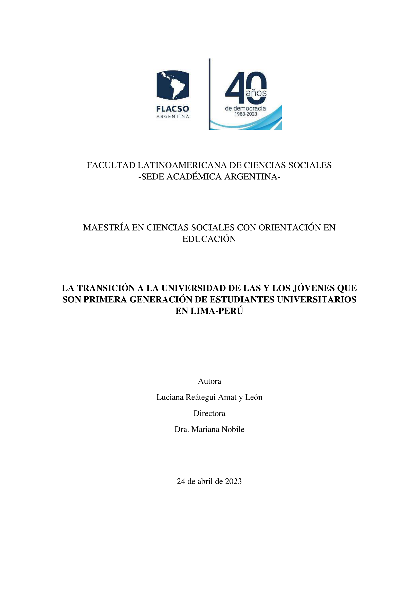 Cita Sugerida : | Reátegui Amat y León, Luciana (2023). La transición a la universidad de las y los jóvenes que son primera generación de estudiantes universitarios en Lima - Perú. Tesis de Maestría. FLACSO. Sede Académica Argentina, Buenos Aires. |