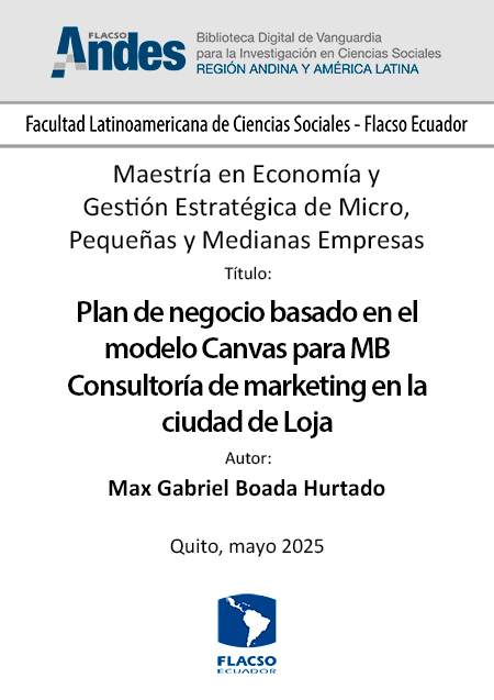 Cita Sugerida : | Boada Hurtado, Max Gabriel. 2025. Plan de negocio basado en el modelo Canvas para MB Consultoría de marketing en la ciudad de Loja. Tesis de maestría, Flacso Ecuador. |