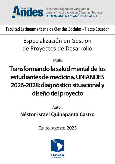 | Cita Sugerida : | Quinapanta Castro, Néstor Israel. 2025. Transformando la salud mental de los estudiantes de medicina, UNIANDES 2026-2028: diagnóstico situacional y diseño del proyecto. Tesina de especialización, Flacso Ecuador. |