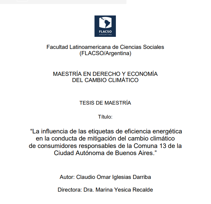 Iglesias Darriba, Claudio Omar. (2021). La influencia de las etiquetas de eficiencia energética en la conducta de mitigación del cambio climático de consumidores responsables de la Comuna 13 de la Ciudad Autónoma de Buenos Aires. Tesis de Maestría. FLACSO. Sede Académica Argentina, Buenos Aires.
