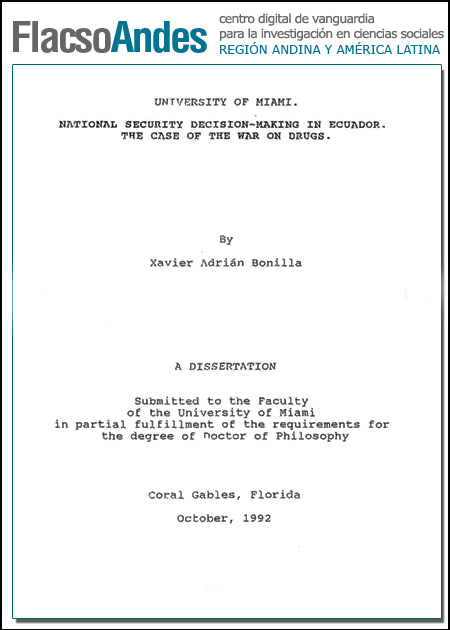 Bonilla, Xavier Adrián (1992). National Security decision - making in Ecuador. The case of the war on drugs. Ph. D. International Studies; University of Miami. Florida, Estados Unidos. 399 p.