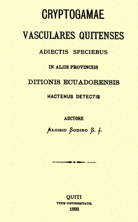 Sodiro, Aloisio . 1893. Cryptogamae Vasculares Quitenses Adiectis Speciebus in Aliis Provinciis Ditionis Ecuadorensis Hactenus Detectis.  Quito, Ecuador : Typis Universitatis.