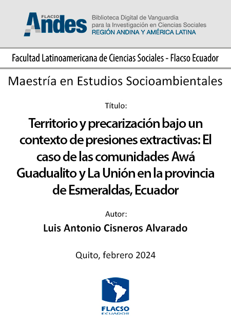 Cisneros Alvarado, Luis Antonio. 2024. Territorio y precarización bajo un contexto de presiones extractivas: El caso de las comunidades Awá Guadualito y La Unión en la provincia de Esmeraldas, Ecuador. Tesis de maestría, Flacso Ecuador.