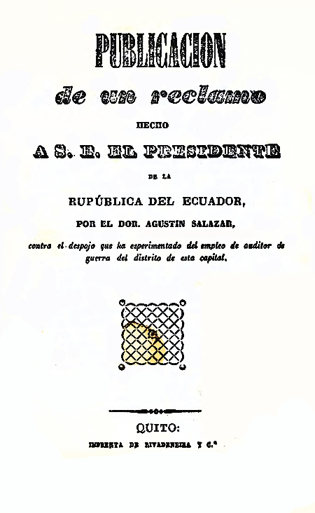 Salazar, Agustin. 1849. Publicación de un reclamo hecho A S. E. El Presidente de la República del Ecuador. Quito, Ecuador : Imp. de Rivadeneira.