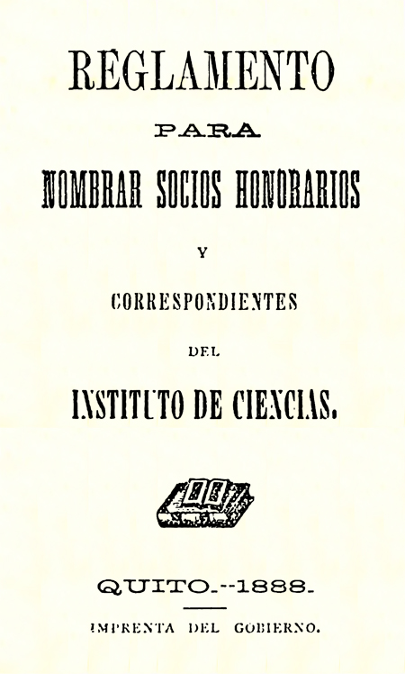 Espinosa, J, Modesto y Muis C. de la Vaca. 1889. Reglamento para nombrar socios honorarios y correspondientes del Instituto de Ciencias. Quito, Ecuador : Imprenta del Gobierno.