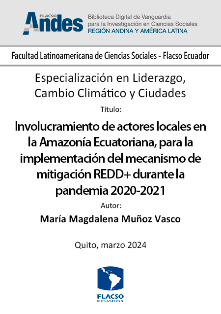 Muñoz Vasco, María Magdalena. 2024. Involucramiento de actores locales en la Amazonía Ecuatoriana, para la implementación del mecanismo de mitigación REDD+ durante la pandemia 2020-2021. Tesina de especialización, Flacso Ecuador.