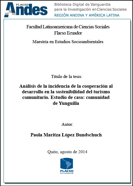 López Bundschuh, Paola Maritza. 2014. Análisis de la incidencia de la cooperación al desarrollo en la sostenibilidad del turismo comunitario. Estudio de caso: comunidad de Yunguilla. Tesis de maestría, Flacso Ecuador.