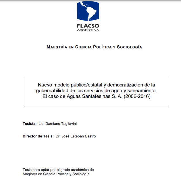 Tagliavini, Damiano. (2019). Nuevo modelo público-estatal y democratización de la gobernabilidad de los servicios de agua y saneamiento : el caso de Aguas Santafesinas S. A. (2006-2016). Tesis de Maestría. FLACSO. Sede Académica Argentina, Buenos Aires.