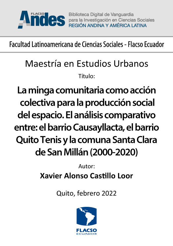 Castillo Loor, Xavier Alonso. 2022. La minga comunitaria como acción colectiva para la producción social del espacio. El análisis comparativo entre: el barrio Causayllacta, el barrio Quito Tenis y la comuna Santa Clara de San Millán (2000-2020). Tesis de maestría, Flacso Ecuador.