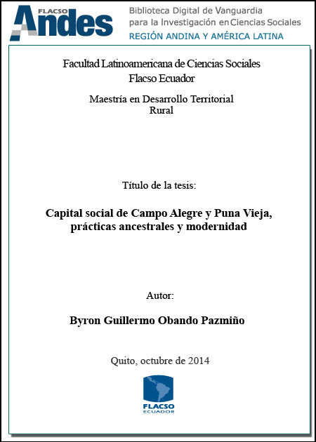 Obando Pazmiño, Byron Guillermo. 2014. Capital social de Campo Alegre y Puna Vieja, prácticas ancestrales y modernidad. Tesis de maestría, Flacso Ecuador.