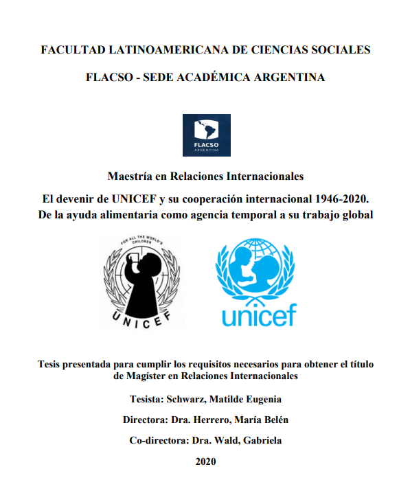 Schwarz, Matilde Eugenia. (2020). El devenir de UNICEF y su cooperación internacional 1946-2020 : de la ayuda alimentaria como agencia temporal a su trabajo global. Tesis de Maestría. FLACSO. Sede Académica Argentina, Buenos Aires.