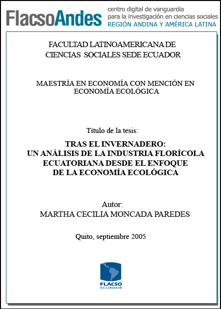Moncada Paredes, Martha Cecilia (2005), Tras el invernadero: un análisis de la industria florícola ecuatoriana desde el enfoque de la economía ecológica. Maestría en Economía. FLACSO sede Ecuador, Quito. 94 p.