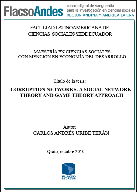 Uribe Terán, Carlos Andrés (2010). Corruption networks : a social network theory and game theory approach. Maestría en Ciencias Sociales con mención en Economía del Desarrollo; FLACSO - Sede Ecuador. Quito. 68 p.