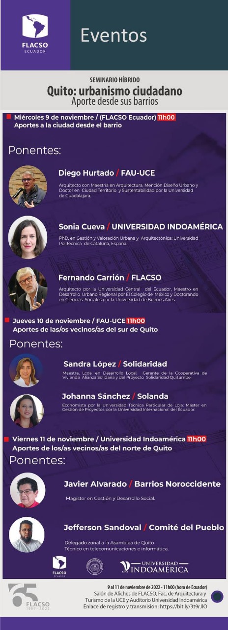 FLACSO Ecuador invita al Seminario Híbrido: Quito: Urbanismo ciudadano. Aporte desde sus barrios. Aportes a la ciudad desde el barrio, el 09 de noviembre de 2022- 11h00 : FLACSO Ecuador, Quito.