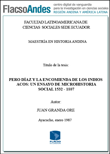 Granda Ore, Juan (1987). Pero Díaz, y la encomienda de los indios Acos: un ensayo de microhistoria social 1532-1607. Maestría en Historia Andina; FLACSO sede Ecuador. Ayacucho 1987.