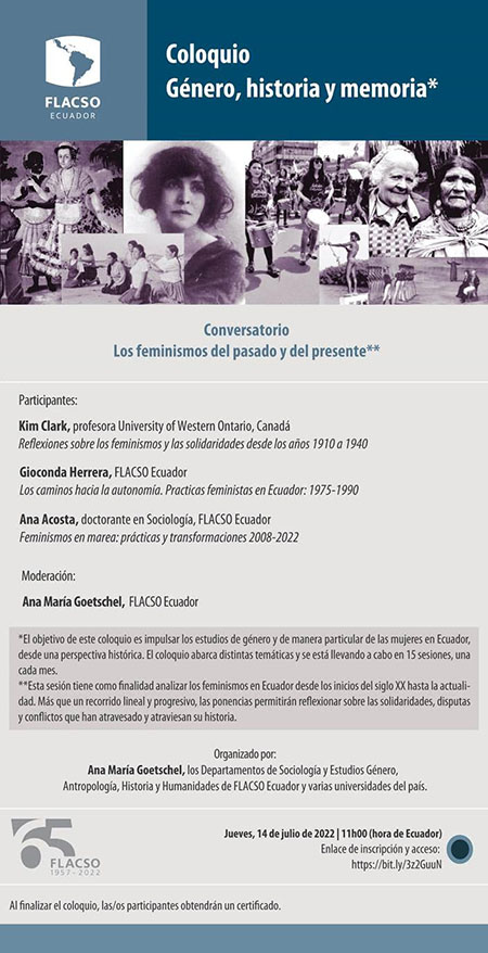 Coloquio de Género, historia y memoria. Los feminismos del pasado y del presente. Jueves, 14 de julio de 2022 - 11h00, con la participación de Kim Clark – profesora University of Western Ontario, Canadá, Gioconda Herrera – FLACSO Ecuador y Ana Acosta – doctorante en Sociología, FLACSO Ecuador.