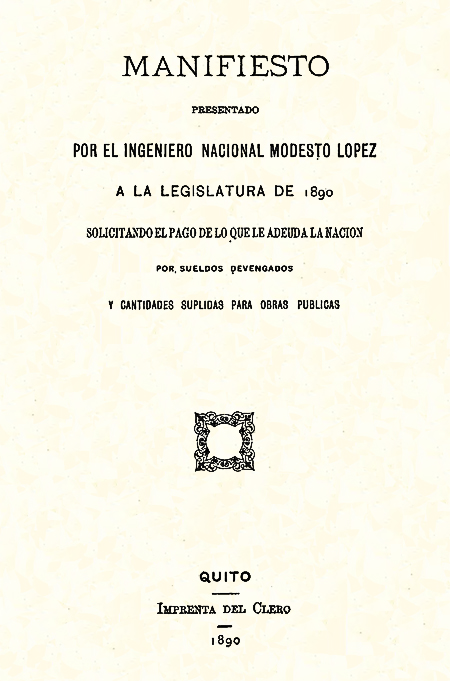 López, Modesto. 1890. Manifiesto presentado por el Ingeniero Nacional Modesto López a la legislatura de 1890 solicitando el pago de lo que le adeuda la Nación por sueldos devengados y cantidades suplidas para obras públicas. Quito, Ecuador : Imprenta del Clero.