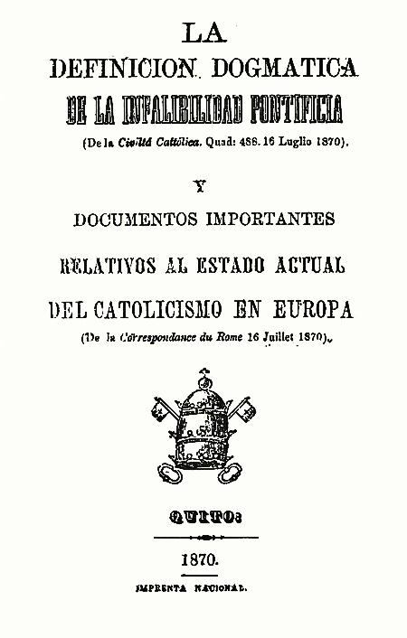 1870. La definición dogmática de la infalibilidad pontificia y Documentos importantes relativos al estado actual del catolicismo en Europa. Quito, Ecuador : Imprenta Nacional.