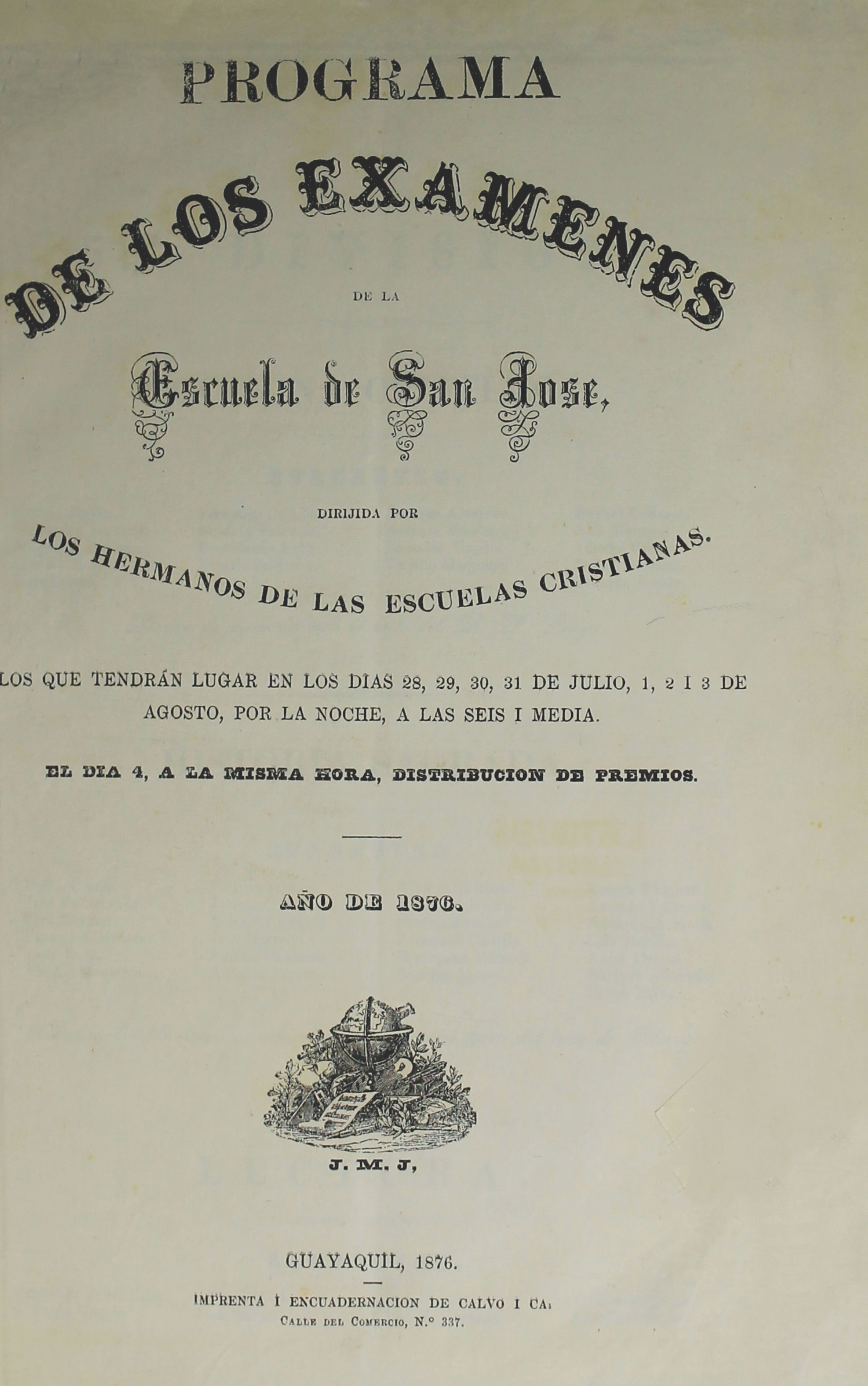 Escuela San José . 1876. Programa de los exámenes de la Escuela de San José, dirijida por Los Hermanos de las Escuelas Cristianas. Los que tendrán lugar en los días 28, 29, 30, 31 de Julio, 1, 2 i 3 de Agosto, por la noche, a las seis i media. El día 4, a la misma hora, distribución de premios. Guayaquil, Ecuador : Imprenta i Encuadernación de Calvo i Ca.