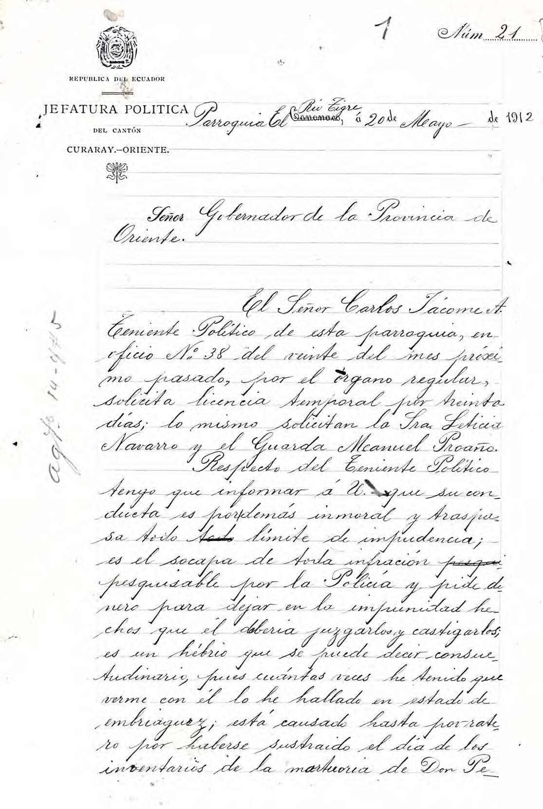 Revisado por Muratorio en 1992, en su mayoría, el sobre 16 contiene informes de tenientes políticos que visibilizan las formas de desplazarse por la zona y administrar el territorio. Estos informes muestran problemas de recaudación de impuestas, la situación de la infraestructura y los avances sobre medios de comunicación, como caminos y navegación. Además, se puede encontrar descripciones de las relaciones entre patrones e indígenas dentro de las haciendas y las formas de proceder en estos conflictos por parte de la autoridad estatal. Destaca el informe presentado por el teniente político Elías Andrade, que ofrece una descripción detallada de la vida de la población indígena y de sus creencias. En resumen, el sobre 16 es un material valioso para entender el ejercicio administrativo en Tena. Años aproximados de los documentos: 1903, 1908, 1909, 1910, 1912, 1913, 1915, 1916, 1917, 1920, 1921, 1923, 1924, 1925, 1926, 1929, 1936, 1938,1939, 1944, 1946, 1952.