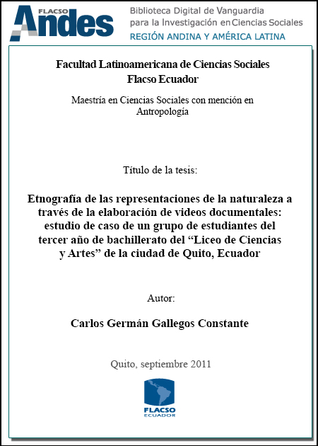 Gallegos Constante, Carlos Germán. 2011. Etnografía de las representaciones de la naturaleza a través de la elaboración de videos documentales: estudio de caso de un grupo de estudiantes de tercer año de bachillerato del "Liceo de Ciencias y Artes" de la ciudad de Quito, Ecuador. Tesis de maestría, Flacso Ecuador.