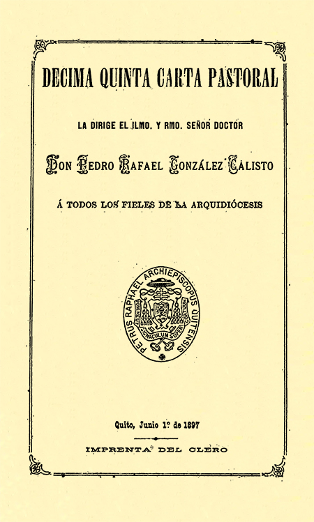 González Calisto, Pedro Rafael. 1897. Décima Quinta Carta Pastoral la dirige el Ilmo. Rmo. Señor Doctor Don Pedro Rafael González y Calisto á todos los fieles de la Arquidiócesis. Quito, Ecuador : Imprenta del Clero.