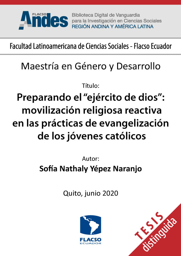 Yépez Naranjo, Sofía Nathaly. 2020. Preparando el “ejército de dios”: movilización religiosa reactiva en las prácticas de evangelización de los jóvenes católicos. Tesis de maestría, Flacso Ecuador.