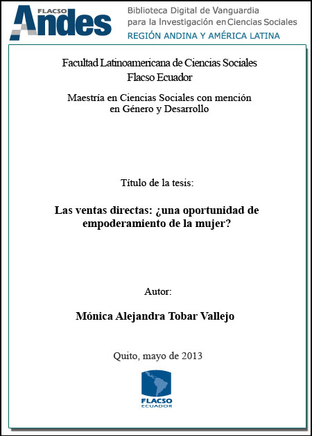 Tobar Vallejo, Mónica Alejandra. 2013. Las ventas directas: ¿una oportunidad de empoderamiento de la mujer? Tesis de maestría, Flacso Ecuador.