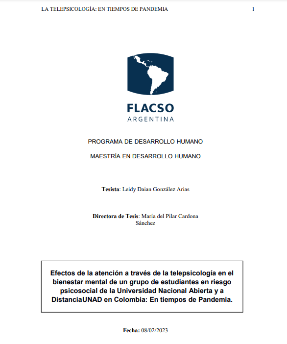 González Arias, Leidy Daian (2022). Efectos de la atención a través de la telepsicología en el bienestar mental de un grupo de estudiantes en riesgo psicosocial de la Universidad Nacional Abierta y a Distancia UNAD en Colombia : en tiempos de pandemia. Tesis de Maestría. FLACSO. Sede Académica Argentina, Buenos Aires.