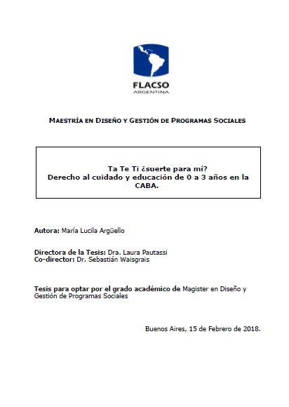 Argüello, María Lucila (2018). Ta Te Ti ¿suerte para mí? : derecho al cuidado y educación de 0 a 3 años en la CABA. Tesis de Maestría. FLACSO. Sede Académica Argentina, Buenos Aires.