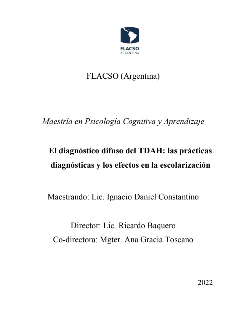 Constantino, Ignacio Daniel (2022). El diagnóstico difuso del TDAH: las prácticas diagnósticas y los efectos en la escolarización. Tesis de Maestría. FLACSO. Sede Académica Argentina, Buenos Aires.