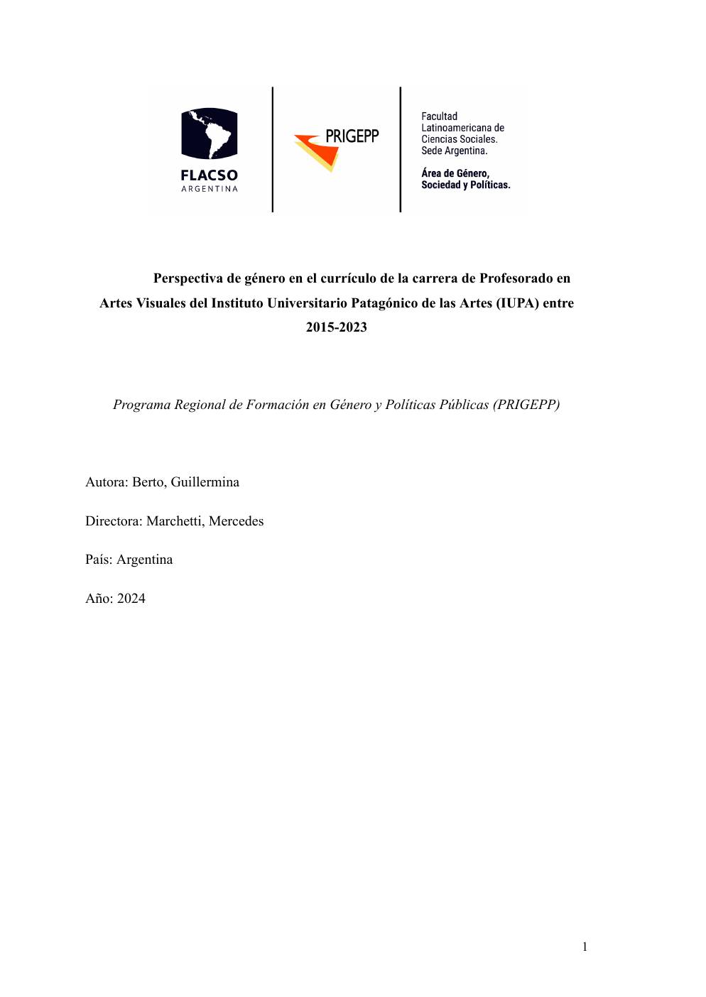 Berto, Guillermina (2024). Perspectiva de género en el currículo de la carrera de Profesorado en Artes Visuales del Instituto Universitario Patagónico de las Artes (IUPA) entre 2015-2023. Tesis de Maestría. FLACSO. Sede Académica Argentina, Buenos Aires.