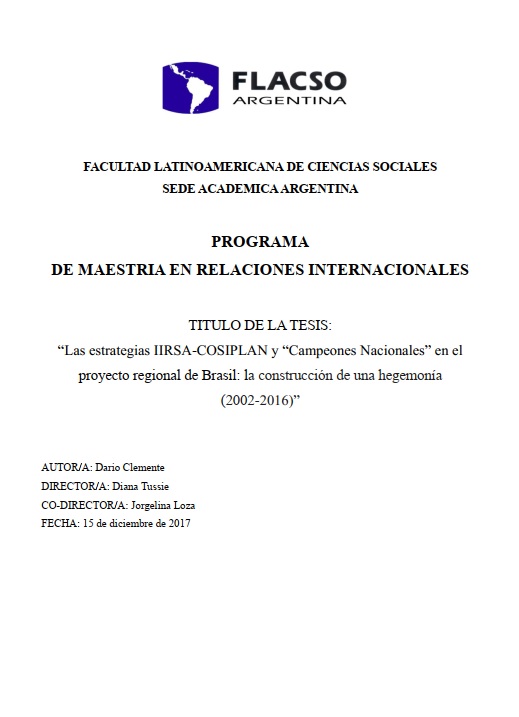 Clemente, Darío (2017). Las estrategias IIRSA-COSIPLAN y Campeones Nacionales en el proyecto regional de Brasil : la construcción de una hegemonía (2002-2016). Tesis de Maestría. FLACSO. Sede Académica Argentina, Buenos Aires.