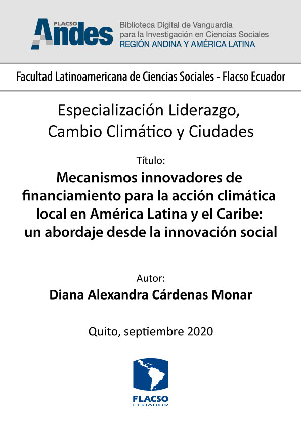 Cárdenas Monar, Diana Alexandra. 2020. Mecanismos innovadores de financiamiento para la acción climática local en América Latina y el Caribe: un abordaje desde la innovación social. Tesina de especialización, Flacso Ecuador.
