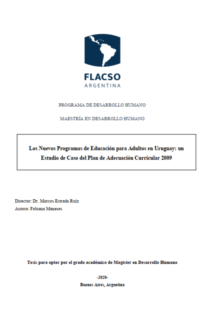 Meneses, Fabiana. (2020). Los nuevos programas de educación para adultos en Uruguay : un estudio de caso del Plan de Adecuación Curricular 2009. Tesis de Maestría. FLACSO. Sede Académica Argentina, Buenos Aires.