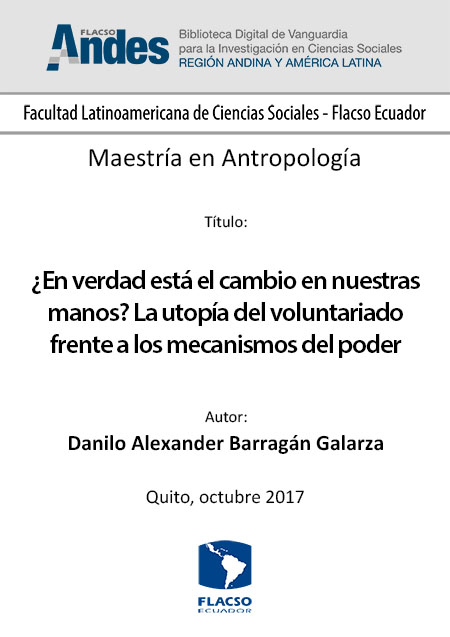 Barragán Galarza, Danilo Alexander. 2017. ¿En verdad está el cambio en nuestras manos? La utopía del voluntariado frente a los mecanismos del poder. Tesis de maestría, Flacso Ecuador.