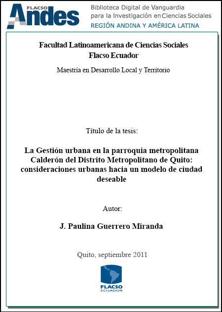 Guerrero Miranda, J. Paulina. 2011. La Gestión urbana en la parroquia metropolitana Calderón del Distrito Metropolitano de Quito: consideracones urbanas hacia un modelo de ciudad deseable. Tesis de maestría, Flacso Ecuador.