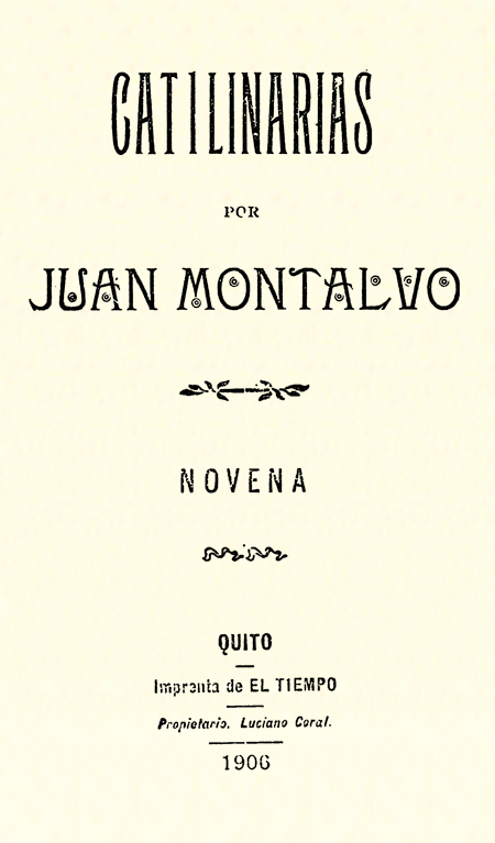 Montalvo Fiallos, Juan María. 1906. Catilinarias : novena por Juan Montalvo. Quito, Ecuador : Imprenta de El Tiempo.