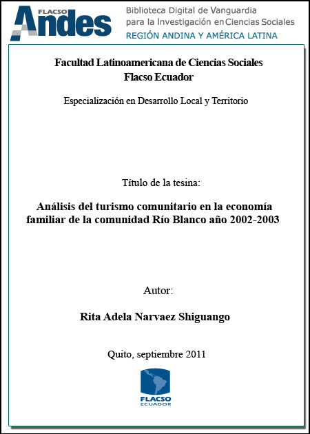 Narvaez Shiguango, Rita Adela. 2011. Análisis del turismo comunitario en la economía familiar de la comunidad Río Blanco año 2002-2003. Tesina de especialización, Flacso Ecuador.