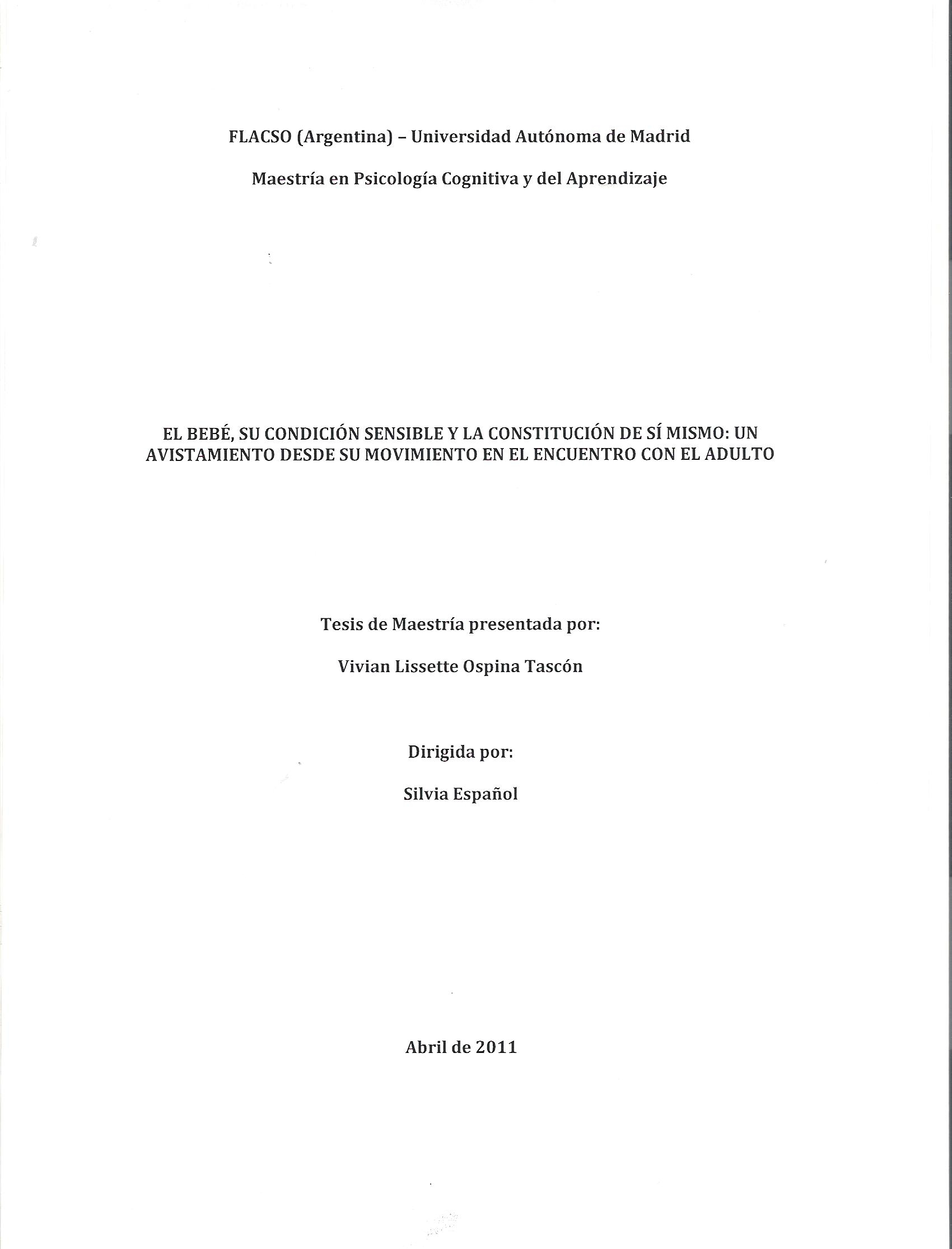 Ospina Tascón, Vivian Lissette (2011). El bebé, su condición sensible y la constitución de sí mismo : un avistamiento desde su movimiento en el encuentro con el adulto. Tesis de Maestría. FLACSO. Sede Académica Argentina, Buenos Aires.
