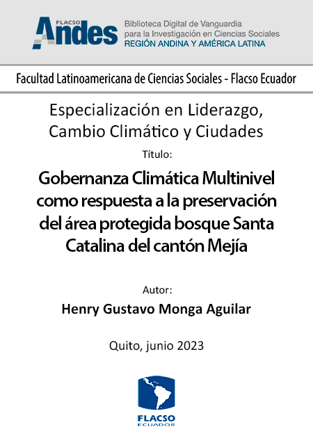 Monga Aguilar, Henry Gustavo. 2023. Gobernanza Climática Multinivel como respuesta a la preservación del área protegida bosque Santa Catalina del cantón Mejía. Tesina de especialización, Flacso Ecuador.
