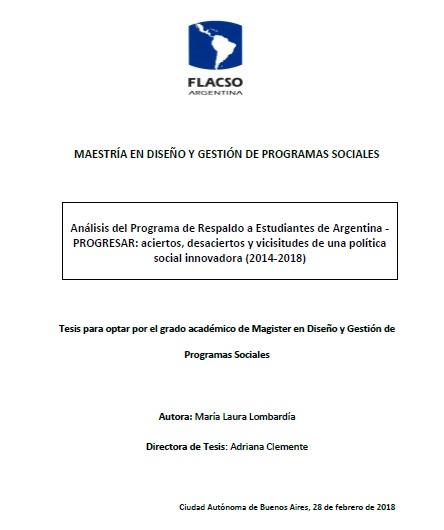 Lombardía, María Laura (2018). Análisis del Programa de Respaldo a Estudiantes de Argentina - PROGRESAR : aciertos, desaciertos y vicisitudes de una política social innovadora ( 2014 - 2018 ). FLACSO. Sede Académica Argentina, Buenos Aires.