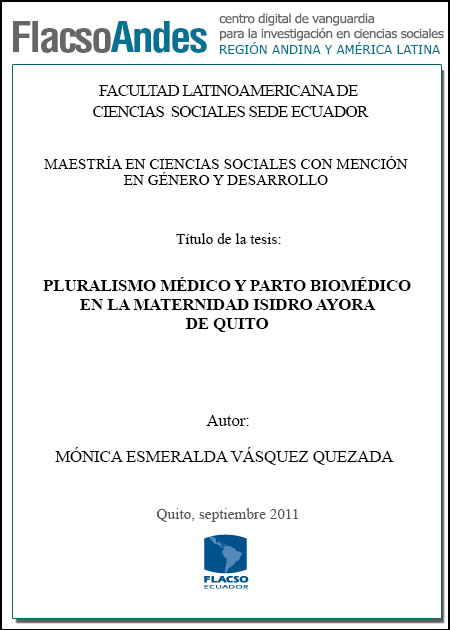 Vásquez, M. E. (2011). Pluralismo médico y parto biomédico en la Maternidad Isidro Ayora de Quito (Tesis de Maestría en Ciencias Sociales con mención en Género y Desarrollo). FLACSO Sede Ecuador, Quito.
