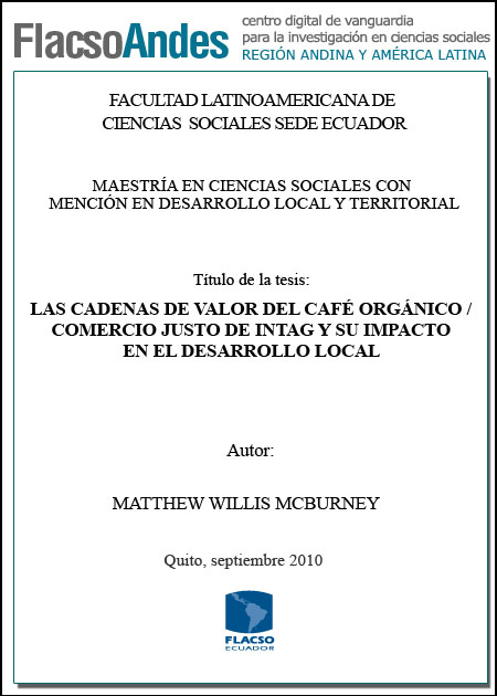 McBurney, Matthew Willis (2010). Las cadenas de valor del café orgánico / comercio justo de Intag y su impacto en el desarrollo local. Maestría en Ciencias Sociales con mención en Desarrollo Local y Territorial; FLACSO - Sede Ecuador. Quito. 84 p