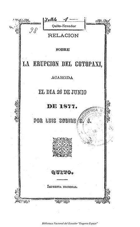 Sodiro, Luis. 1877. Relación sobre la erupción del Cotopaxi acaecida el día 26 de junio de 1877. Quito : Imprenta Nacional.