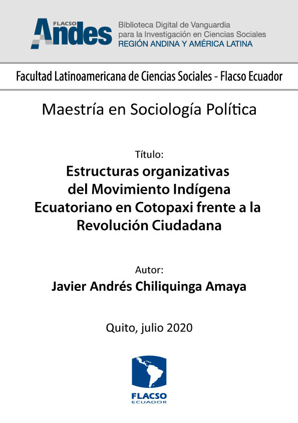 Chiliquinga Amaya, Javier Andrés. 2020. Estructuras organizativas del Movimiento Indígena Ecuatoriano en Cotopaxi frente a la Revolución Ciudadana. Tesis de maestría, Flacso Ecuador.